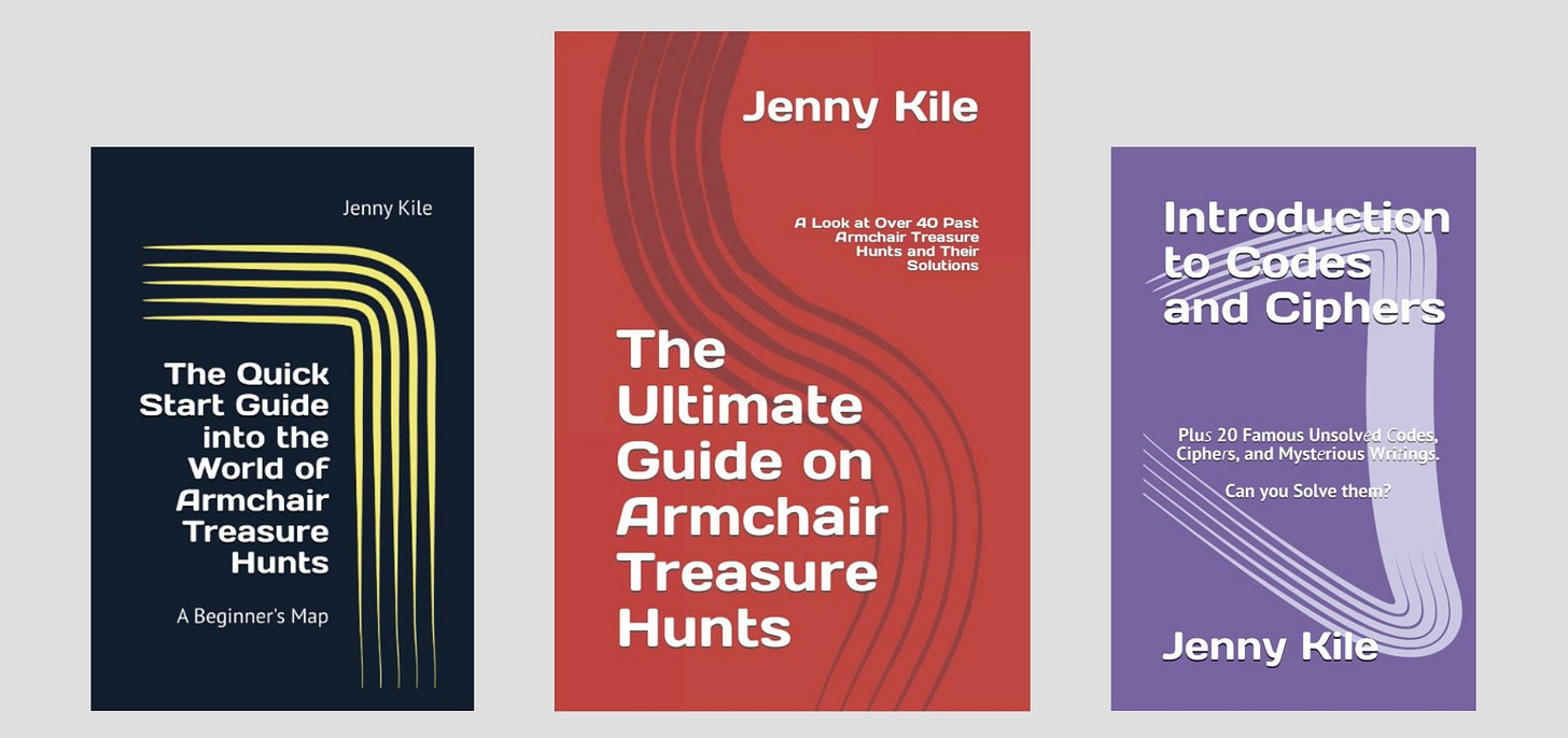 I’ve also written Introduction to Codes and Ciphers (for treasure hunts) and The Ultimate Guide to Armchair Treasure Hunts. I manage the leading website on armchair treasure hunts - Mysterious Writings - for close to 15 years now.